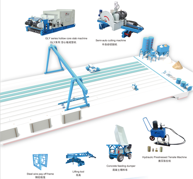 山東興玉機(jī)械科技有限公司專業(yè)研制、生產(chǎn)預(yù)應(yīng)力混凝土預(yù)制構(gòu)件成型機(jī)械的專業(yè)廠家,本公司生產(chǎn)的GLY預(yù)應(yīng)力混凝土空心板成型機(jī)-樓板機(jī)(非圓孔、圓孔)具有設(shè)計合理、操作簡單、維修方便、易損件壽命長等特點。所產(chǎn)出的空心板材表面光滑,結(jié)構(gòu)密實,強(qiáng)度及幾何尺寸均能符合國家有關(guān)規(guī)范要求,制板長度可由4.2米至18米,板寬為600mm、900mm、1200mm,板材厚度為120mm、150mm、180mm、200mm、250mm、300mm、380mm,是大開間廠房、學(xué)校、醫(yī)院、商場、辦公樓大型倉庫及民用住宅等所用跨度大、承載高的空心板材經(jīng)濟(jì)、理想的生產(chǎn)設(shè)備。